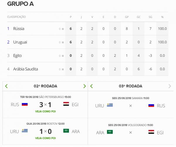 Com os mesmos seis pontos em duas rodadas, Rússia e Uruguai lideram a chave – a seleção da casa leva vantagem no saldo de gols (7 a 2) e depende de um empate para terminar na ponta. Egito e Arábia Saudita, ainda zerados, já estão eliminados da Copa do Mundo.