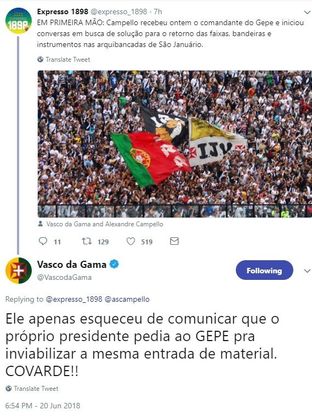 Um caso inusitado aconteceu no Twitter envolvendo um grande clube brasileiro. Uma página que posta notícias do Vasco da Gama veiculou que o presidente Alexandre Campello se reuniu com o comandante do GEPE para solucionar a questão dos materiais das torcidas organizadas do clube, que não estavam podendo entrar com faixas, bandeiras e instrumentos.