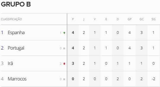 Após os resultados da segunda rodada do Grupo B da Copa do Mundo (Portugal 1 x 0 Marrocos e Irã 0 x 1 Espanha), Portugal e Espanha estão empatados na liderança em todos os critérios. Na última rodada, Portugal enfrenta o Irã precisando do empate para avançar às oitavas de final e pode se classificar até mesmo perdendo, dependendo do resultado de Espanha x Marrocos. Ambas as partidas acontecem no mesmo dia e horário: 2ª-feira, 25/06, às 15h (horário de Brasília).