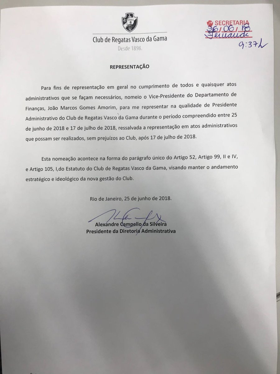 Com o @bgiufrida: João Marcos Amorim, VP de Finanças, foi nomeado presidente interino do Vasco durante o período em que Campello estiver na Rússia. #gevas