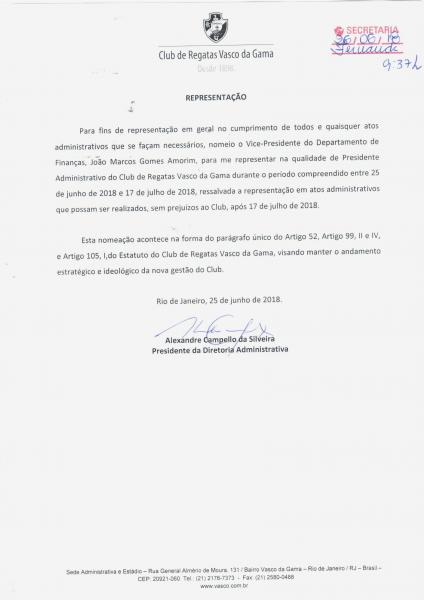 O Club de Regatas Vasco da Gama ressalta ainda que, para fins de representação em geral no cumprimento de todos e quaisquer atos administrativos que se façam necessários, o Presidente Administrativo, Alexandre Campello, nomeou como seu representante o Vice-Presidente do Departamento de Finanças, João Marcos Gomes Amorim.