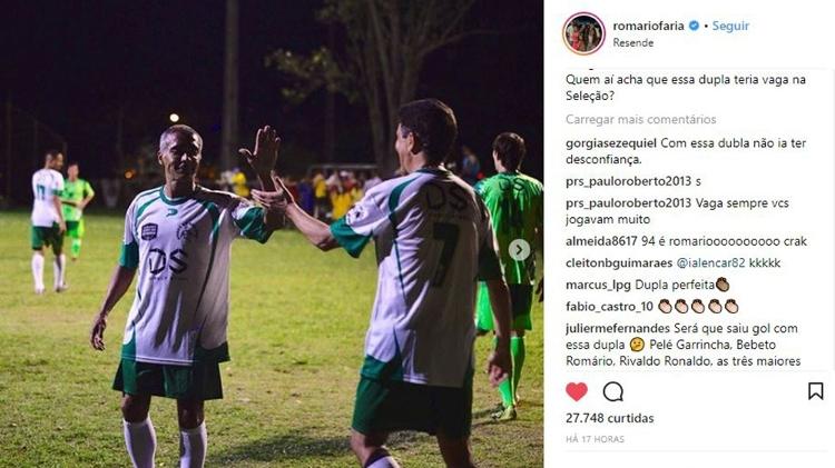 "Parece 94, mas é 2018. Eu e Bebeto, meu parceiro de campo, no jogo beneficente Amigos do Romário x Amigos da Pestalozzi. Quem aí acha que essa dupla teria vaga na seleção?", escreveu Romário em sua conta no Instagram.