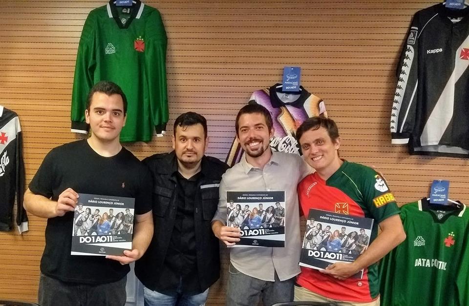 O Livro "Do 1 ao 11 - Onze temporadas da camisa vascaína", de Dário Lourenço (na foto abaixo ele é o único que não está segurando um exemplar), que conta a história das camisas do Vasco nos anos 1990, foi lançado no último domingo, no dia 1º de julho, no Maracanã. O vice-presidente de comunicação do Vasco, Diego Carvalho (de camisa do Vasco), prestigiou o evento.