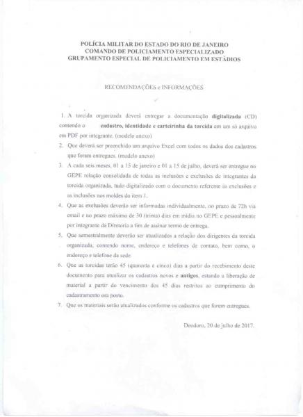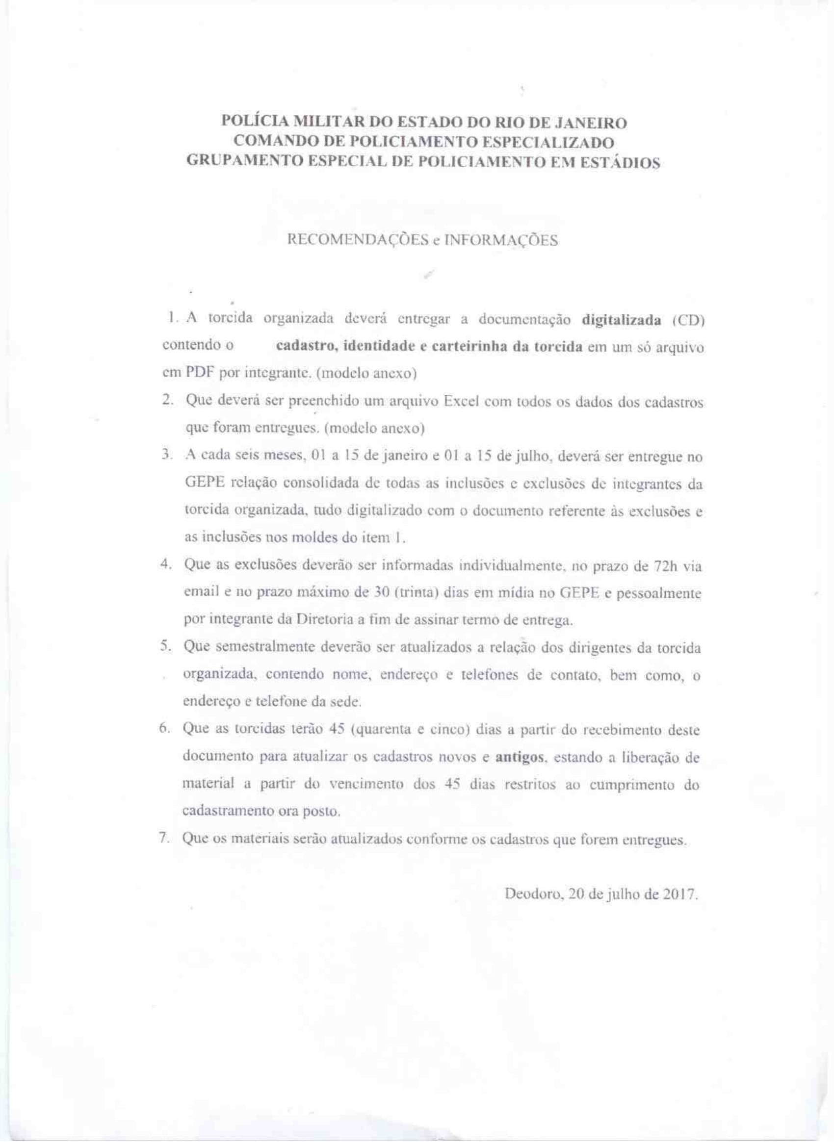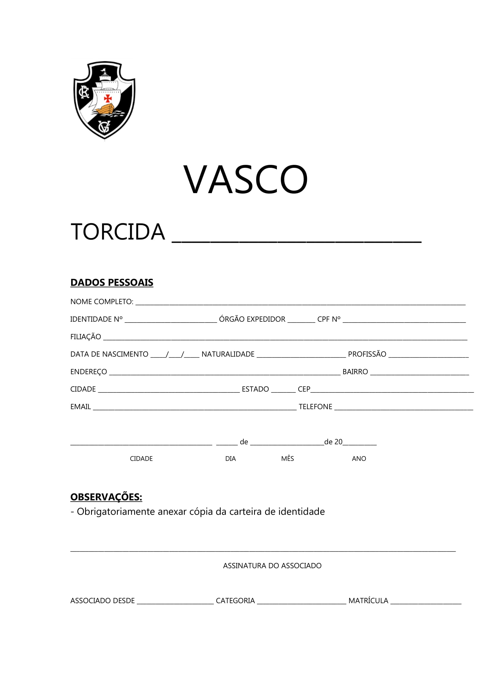 O Club de Regatas Vasco da Gama está disponibilizando um modelo de formulário de identificação de seus membros que ficará disponível para retirada em São Januário. Tal formulário deverá ser preenchido individualmente e conter, em anexo, xerox da identidade e da carteirinha da torcida. A documentação, digitalizada, será entregue ao Grupamento Especial de Policiamento em Estádios (GEPE).
