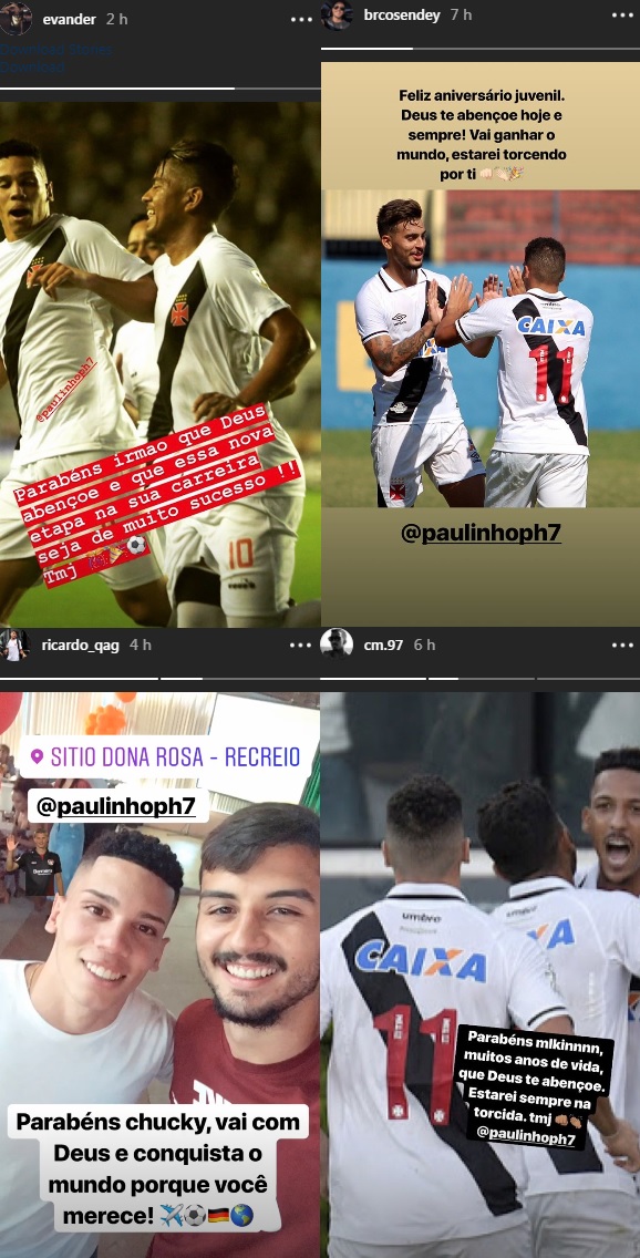 Evander, Bruno Cosendey, Ricardo Graça e Caio Monteiro, por meio de suas contas no Instagram, parabenizaram Paulinho, que completou 18 anos no último domingo. O atacante deixou o Vasco recentemente para jogar no Bayer Leverkusen, da Alemanha.