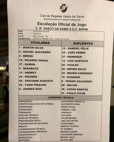 15/07/18 - Confira os relacionados de Vasco e Bahia para o jogo desta 2ª-feira