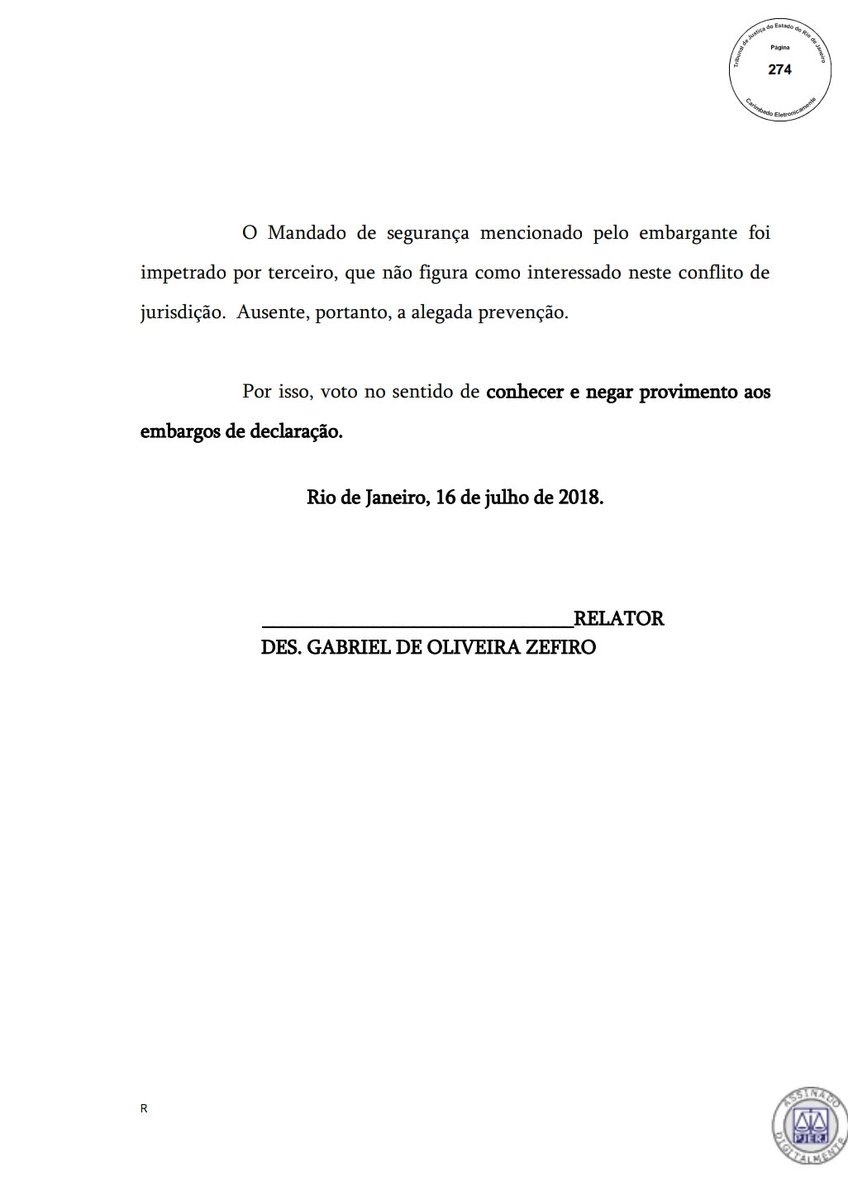 Caso HD: acabou de ser publicado o acórdão do desembargador relator Gabriel Zefiro, do julgamento de ontem que por maioria rejeitou embargos de declaração opostos pelo Vasco. Nele, o argumento - rejeitado - do clube: prevenção a outro desembargador de outra ação. Espia #lanceVAS