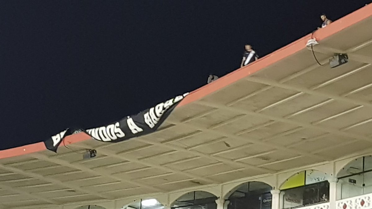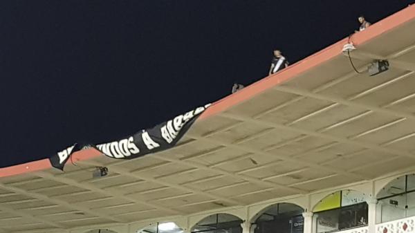 Faixa com a frase "Bem-vindos a barreira do Vasco" está sendo esticada na marquise de São Januário, na altura da saída 5, atrás de um dos gols. #VasFlu
