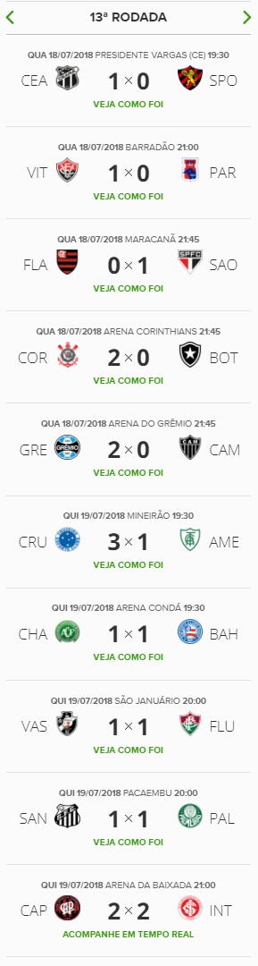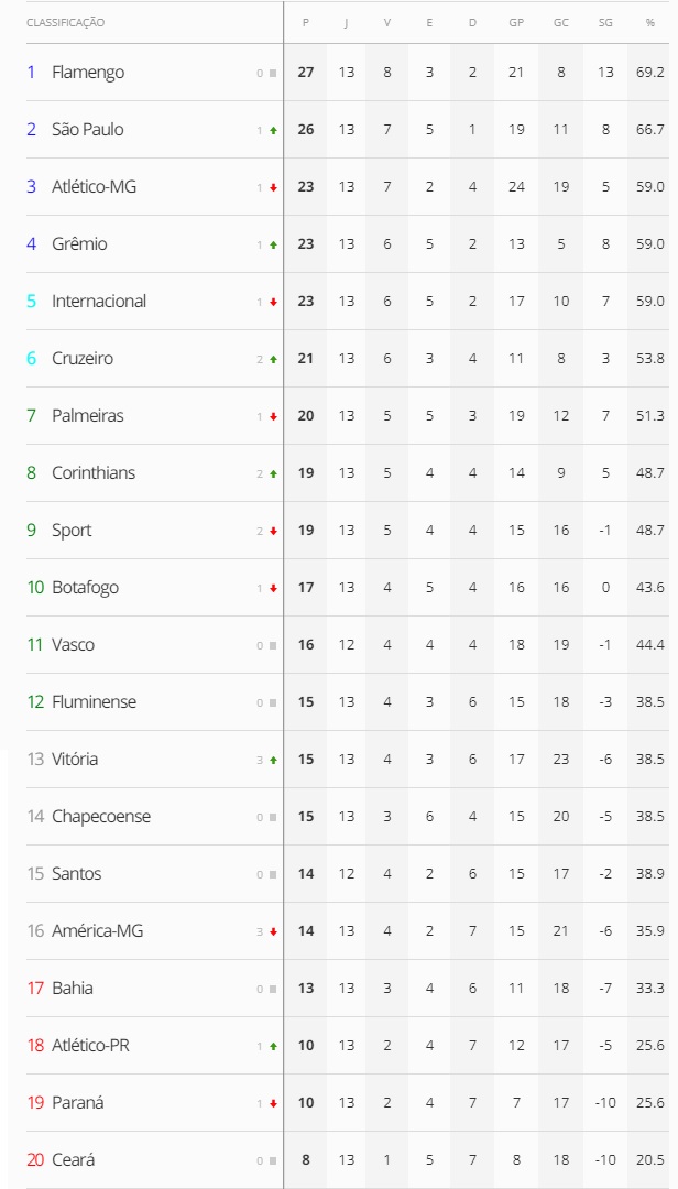 Terminada a 13ª rodada do Campeonato Brasileiro, o Vasco, que empatou com o Fluminense por 1 a 1, segue na 11ª colocação na classificação e agora está a 5 pontos do G6 e a 3 do Z4.