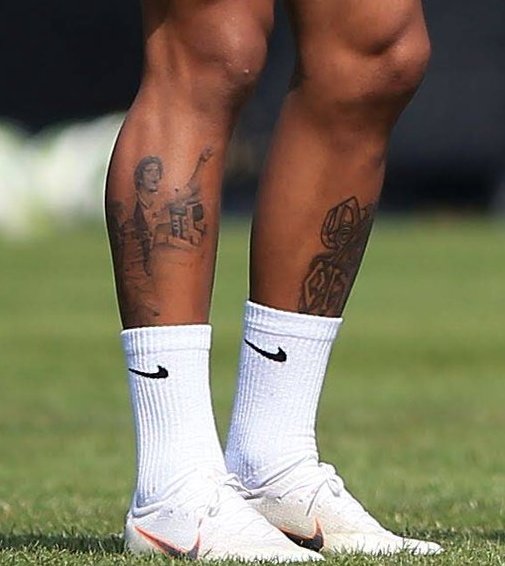 Revelado em São Januário, o volante Douglas Luiz tem tatuado em sua panturrilha uma de suas comemorações com a camisa do Gigante. #RaizSerVasco