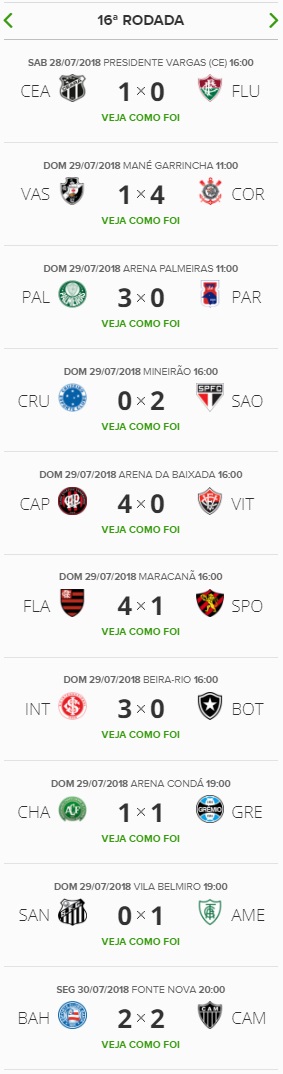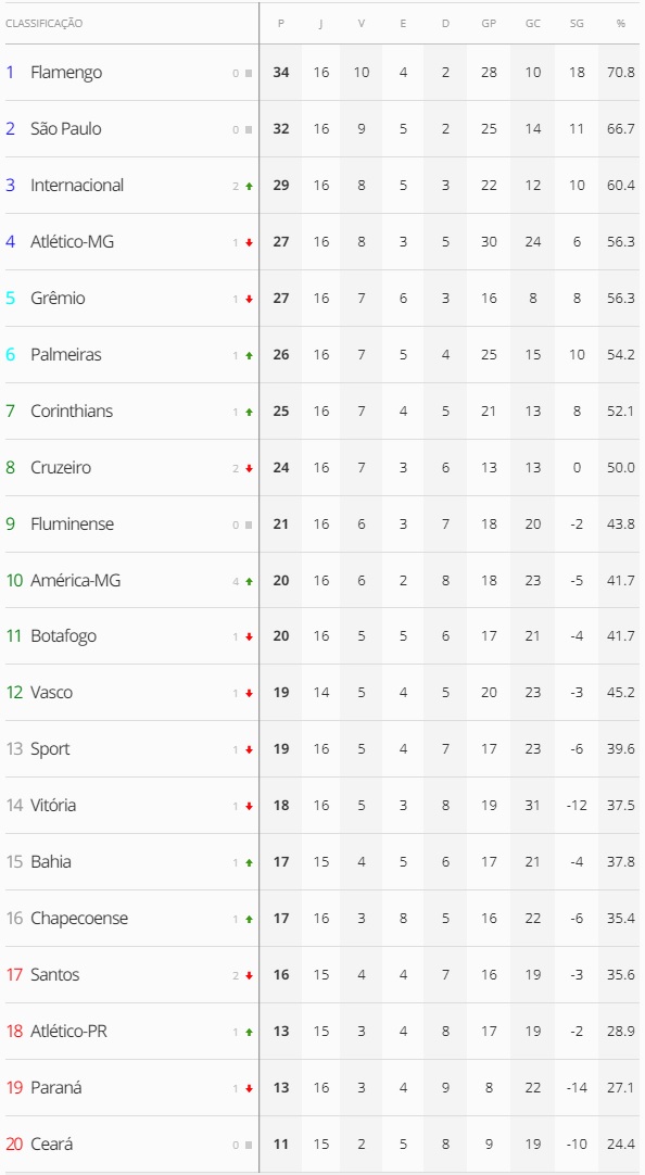 Terminada a 16ª rodada do Campeonato Brasileiro, o Vasco, que perdeu para o Corinthians por 4 a 1, caiu da 11ª para a 12ª colocação na classificação e agora está a 7 pontos do G6 e a 3 do Z4.