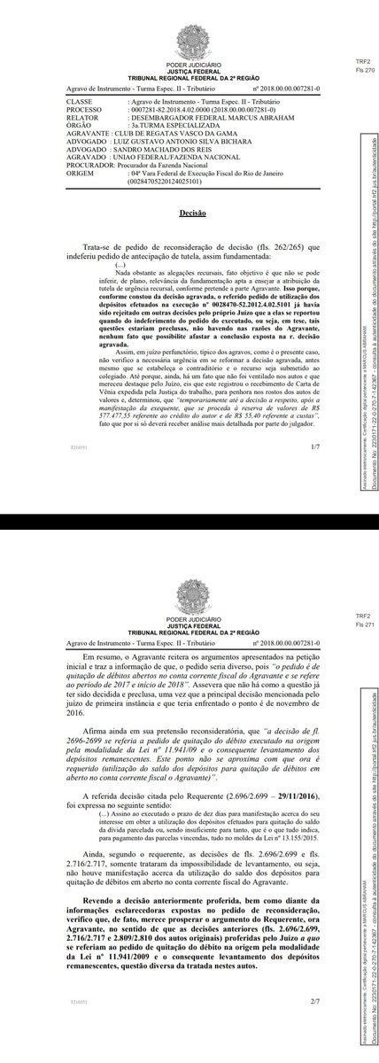 Decisão do TRF-2 do último dia 16, publicada na última quarta, detalha a autorização para o Vasco usar R$ 28.621.665,16 depositados judicialmente em quitação de débitos fiscais em aberto de 2017 ao início de 2018. Espia a íntegra #lanceVAS