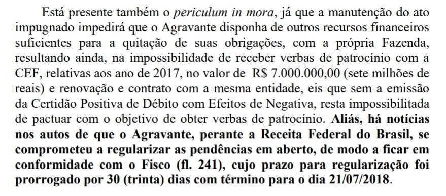 Detalhe da decisão: o TRF-2 apontou também justificando o ato que com isto, o Vasco recupera as certidões necessários para poder receber os R$ 7 milhões "presos" do patrocínio de 2017 com a Caixa Econômica Federal, e possível renovação de contrato com a mesma entidade #lanceVAS
