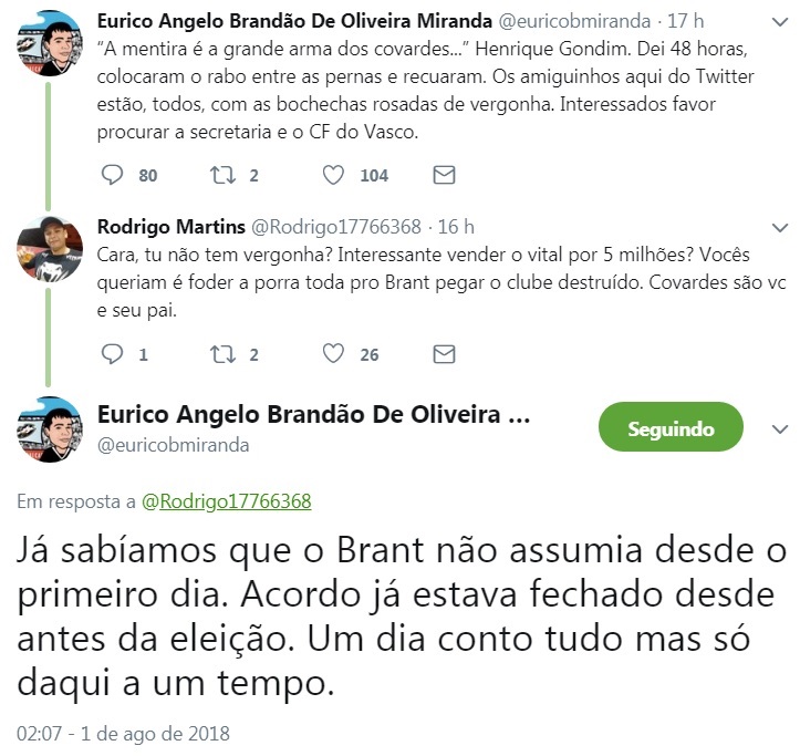 Fonte: Twitter do ex-VP de futebol do Vasco Eurico Brandão Miranda