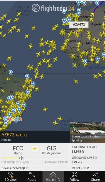 Voo com Leandro Castán atrasou 52 minutos na decolagem. Com isso, estimativa do desembarque no Galeão passou para 5h03 desta sexta-feira. No detalhe na imagem do Flight Radar 24, é o avião em vermelho neste momento. Espia #lanceVAS