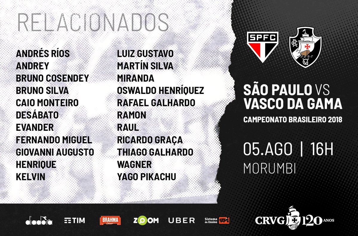 Confira os relacionados do Vasco para o jogo contra o São Paulo