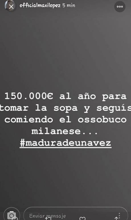 Minutos depois, Maxi usou sua própria conta na mesma rede social para se manifestar. Embora não tenha usado o nome de Wanda, tampouco citado os filhos, a postagem do argentino foi claramente dedicada à ex-mulher, e com direito a ironia: "150 mil euros por ano para tomar a sopa e continua comendo o ossobuco à milanesa", publicou Maxi, indicando que envia uma alta quantia de dinheiro para Wanda e seus três filhos.