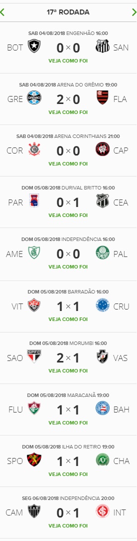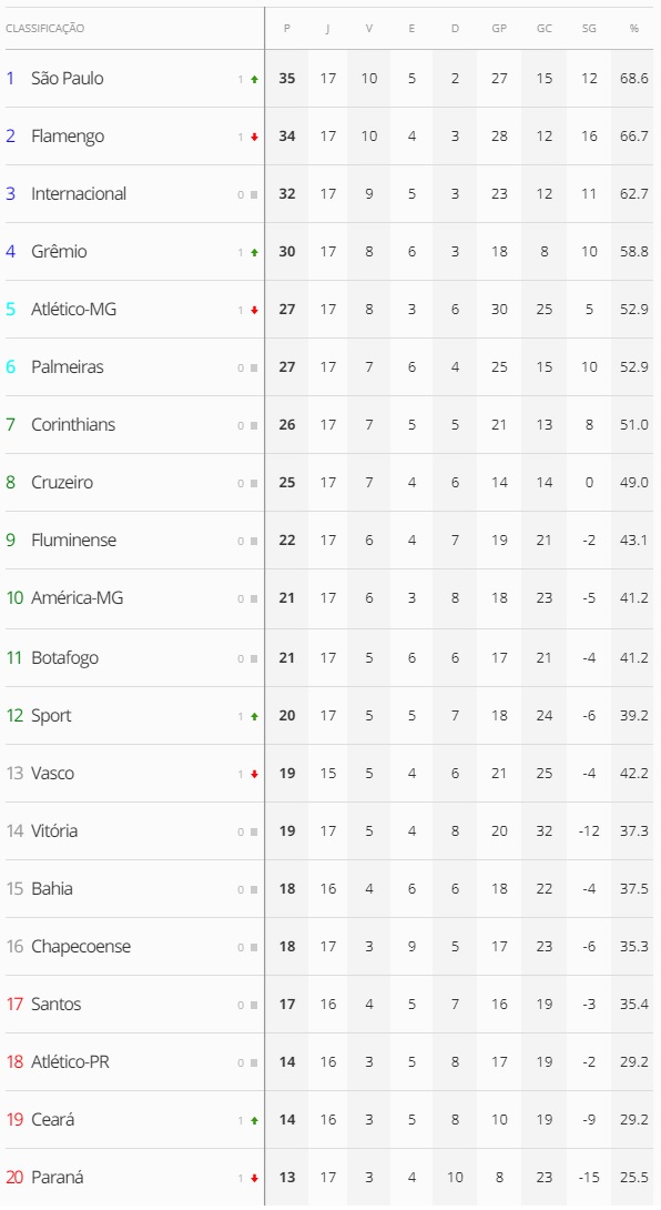 Terminada a 17ª rodada do Campeonato Brasileiro, o Vasco, que perdeu para o São Paulo por 2 a 1, caiu da 12ª para a 13ª colocação na classificação e agora está a 8 pontos do G6 (estava a 7) e a 2 do Z4 (estava a 3).