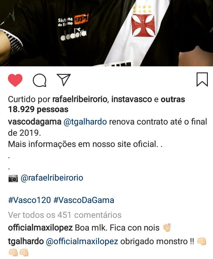 07/08/18 - Em rede social, Thiago Galhardo comemora renovação com o Vasco
