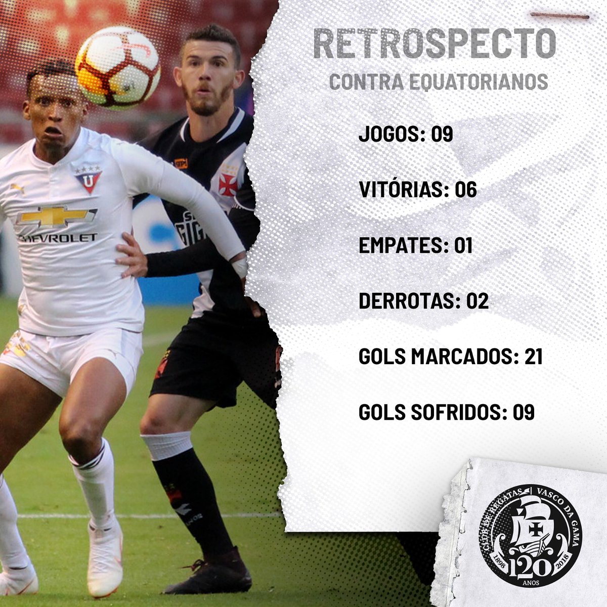 Em 9 jogos contra times do Equador, Vasco tem 6 vitórias, 1 empate e 2 derrotas