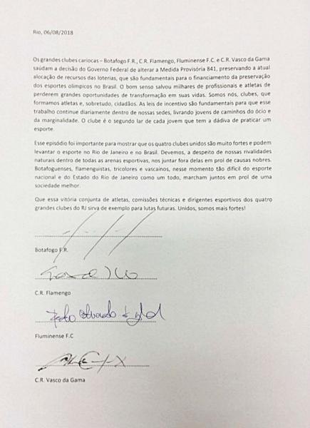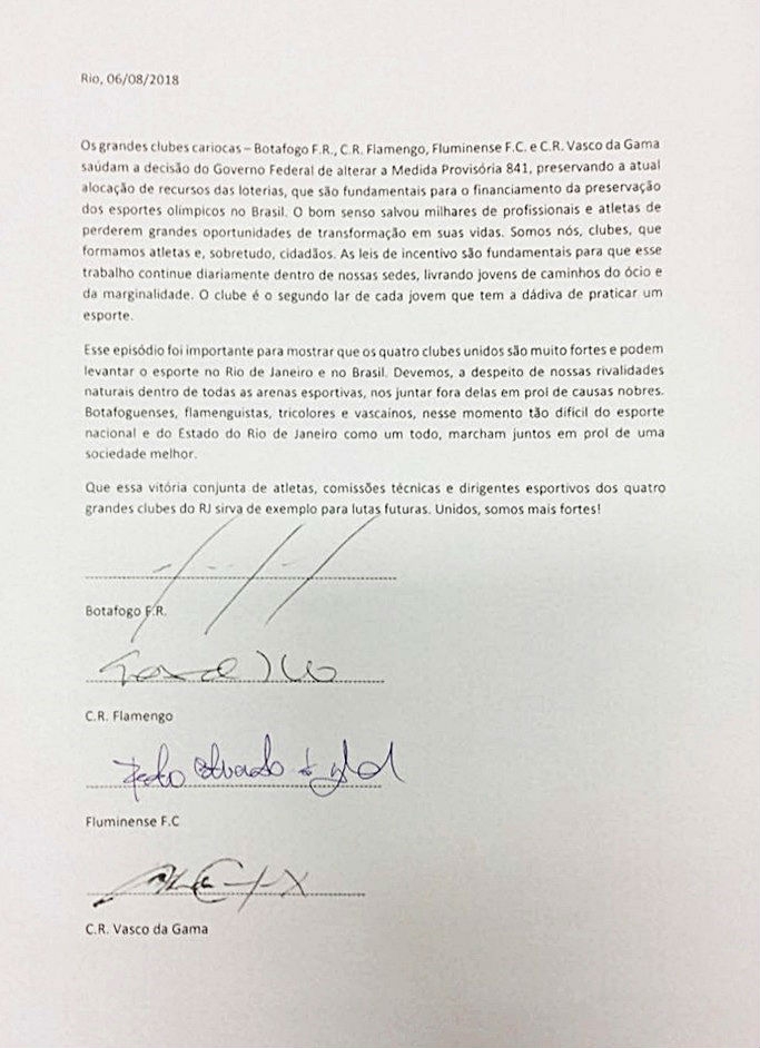 Botafogo, Flamengo, Fluminense e Vasco publicaram uma nota conjunta para enaltecer a decisão do Governo Federal de alterar a MP 841 e manter a alocação de recursos das loterias para financiamento dos esportes olímpicos do Brasil. #gevas