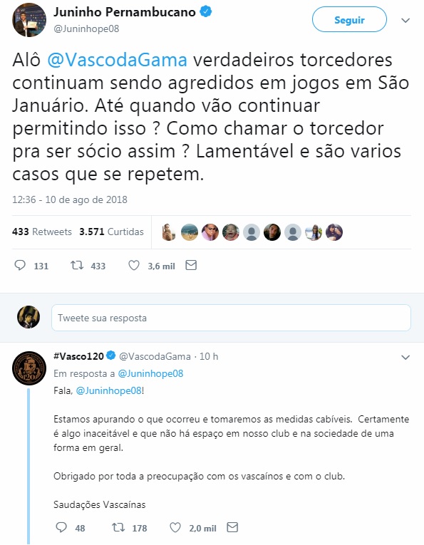 Veja a troca de tuítes entre Juninho Pernambucano e o Vasco: