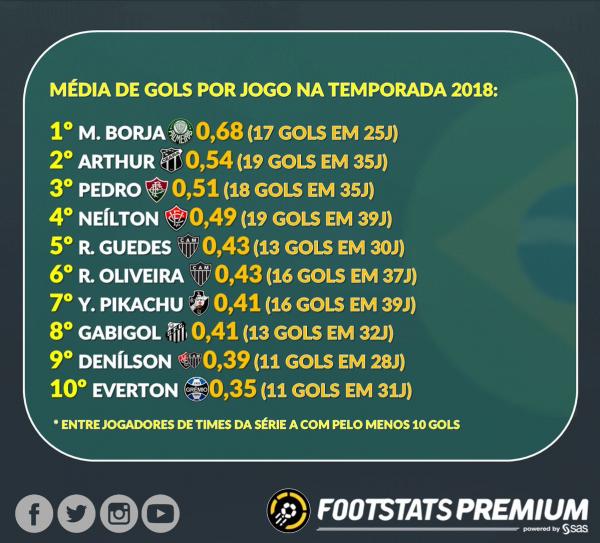 Com 17 gols em 25 jogos, Miguel Borja tem a maior média entre todos os jogadores que fizeram ao menos 10 gols; 0,68 PJ