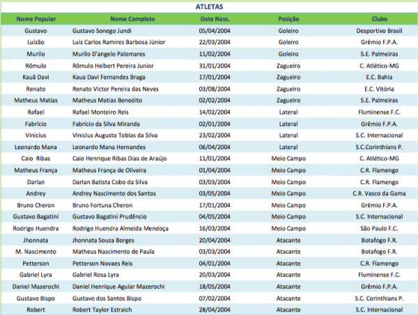Um grupo de 25 atletas nascidos em 2004 foi chamado pelo técnico Paulo Victor Gomes para uma temporada de treinos com a seleção brasileira sub-15 na Granja Comary, entre os dias 19 e 24 de agosto. O Grêmio domina a lista com quatro convocados, seguido por Flamengo e Internacional, ambos com três (confira os nomes no pé).