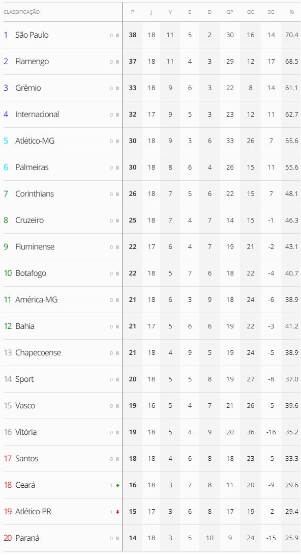 A um jogo do fim da 18ª rodada do Campeonato Brasileiro, o Vasco, que perdeu para o Palmeiras por 1 a 0, caiu da 13ª para a 15ª colocação na classificação e agora está a 11 pontos do G6 (estava a 8) e a 1 do Z4 (estava a 2).