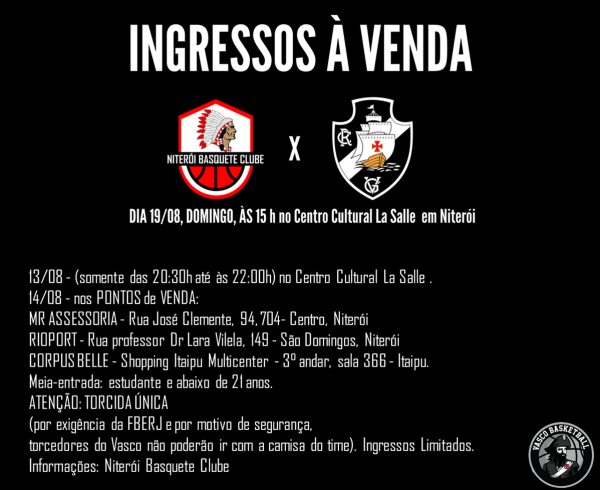 Basquete: Informações sobre ingressos jogo contra o Niterói pelo Estadual; regra de torcida única proíbe camisa do Vasco