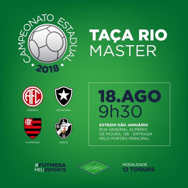 A Vice-presidência da modalidade Bola 12 Toques, juntamente com seus integrantes da diretoria convida a todos os atletas Masters filiados da modalidade, para participar da Taça Rio de Equipes, que realizar-se-á no CT de Futmesa do C.R. Vasco da Gama, no dia 18/08/2018, a partir das 9:00 horas, com início às 9:30 horas.