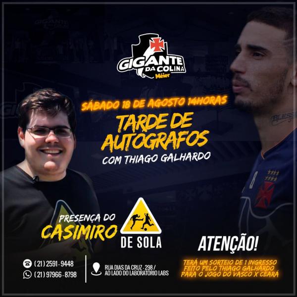 MAIS UM DIA!!!!! Na Loja do Gigante da Colina, no Meier, Thiago Galhardo vai participar de uma tarde de autógrafos à partir das 14h. O evento também contará com a presença do @Casimiro, do Canal De Sola.