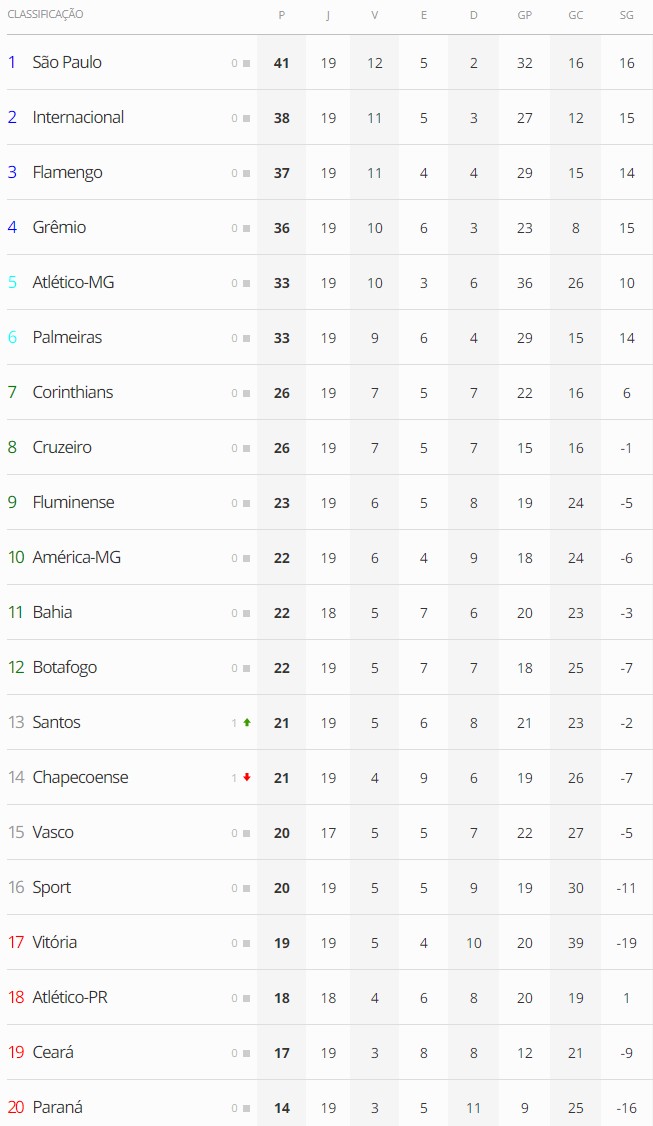 Terminada a 19ª rodada do Campeonato Brasileiro, o Vasco, que empatou com o Ceará por 1 a 1, seguiu na 15ª colocação na classificação e agora está a 13 pontos do G6 (estava a 11) e segue a 1 do Z4.