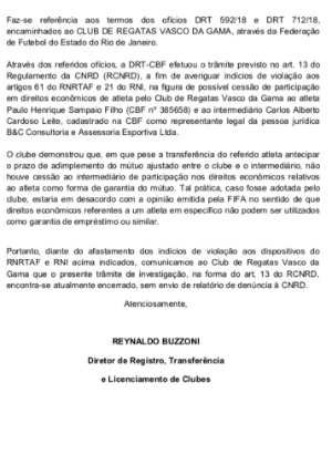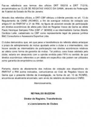 Em ofício enviado na última sexta-feira (17), a CBF respondeu à Ferj (Federação de Futebol do Rio de Janeiro) confirmando que o Vasco não violou as regras da Fifa no processo de venda do atacante Paulinho para o Bayer Leverkusen (ALE).