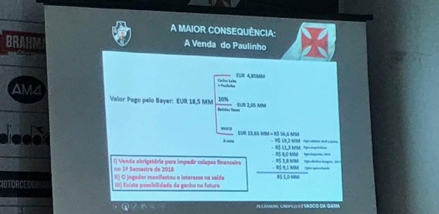 Em apresentação a conselheiros na semana passada, o presidente do clube, Alexandre Campello, divulgou este slide sobre a venda de Paulinho: