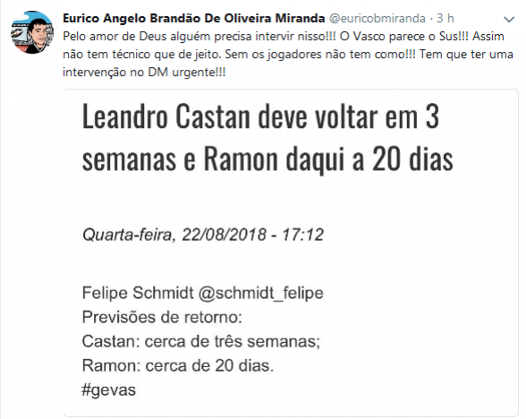 Fonte: Twitter do ex-VP de futebol do Vasco Eurico Brandão Miranda