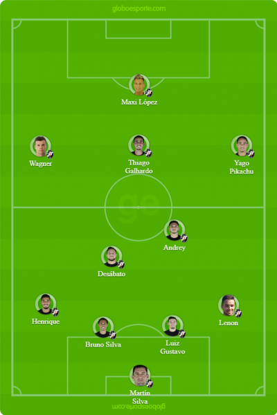 Quem está fora: Ramon (edema na coxa esquerda), Leandro Castan (luxação no ombro direito), Giovanni Augusto (trauma no tornozelo esquerdo), Breno (dores no joelho esquerdo), Werley (fratura no braço direito) e Rildo (cirurgia no ombro esquerdo).