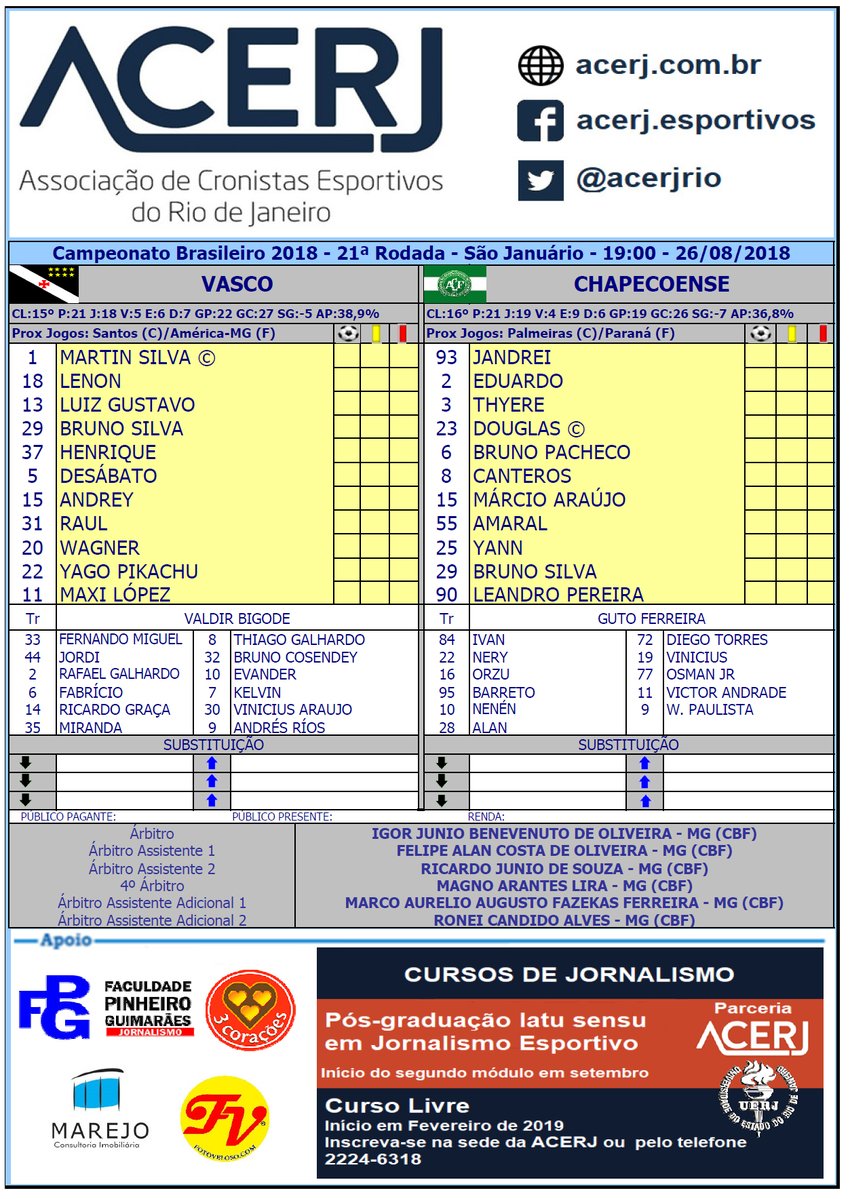 26/08/18 - Confira desfalques e pendurados de Vasco e Chapecoense