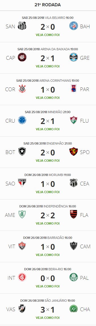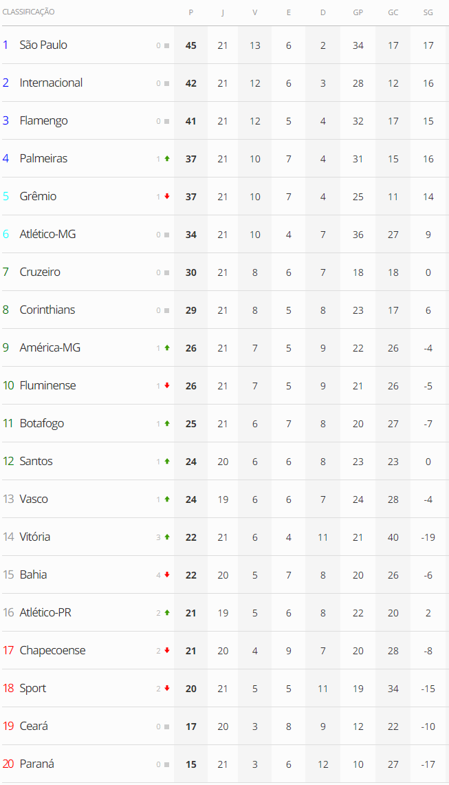 Terminada a 21ª rodada do Campeonato Brasileiro, o Vasco, que venceu a Chapecoense por 3 a 1, subiu da 14ª para a 13ª colocação na classificação e está a 10 pontos do G6 (antes eram 13) e subiu para 3 do Z4 (estava a 2 pontos).