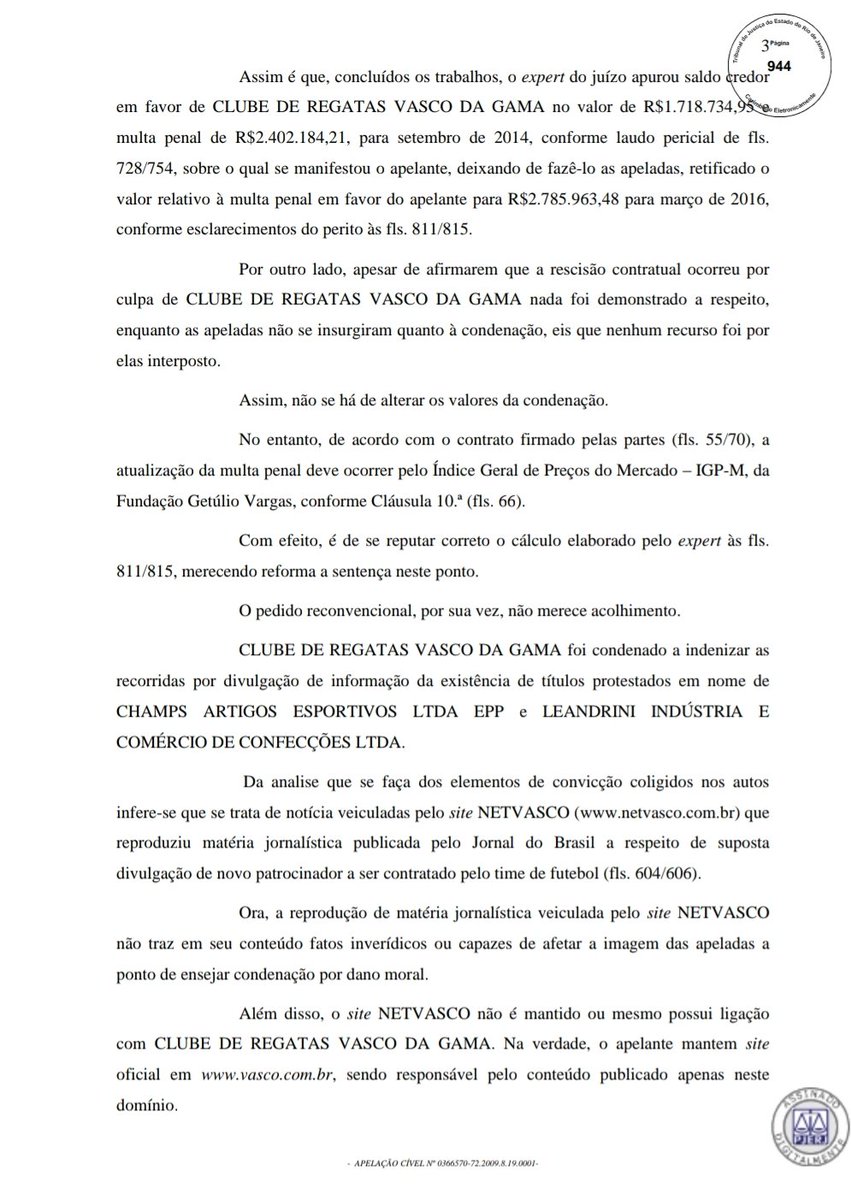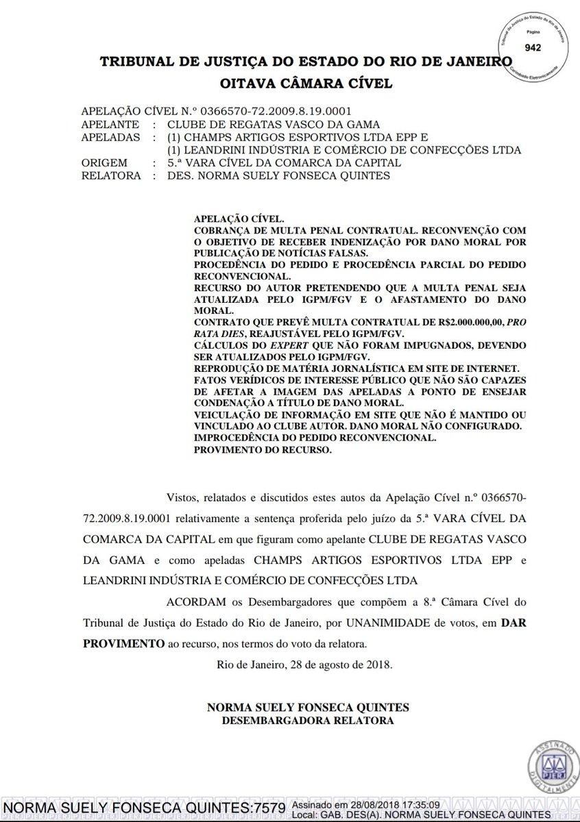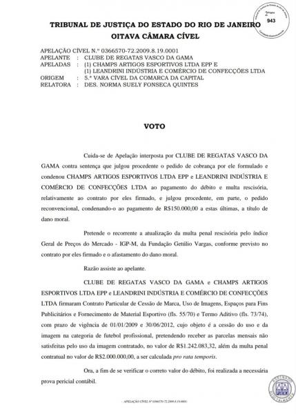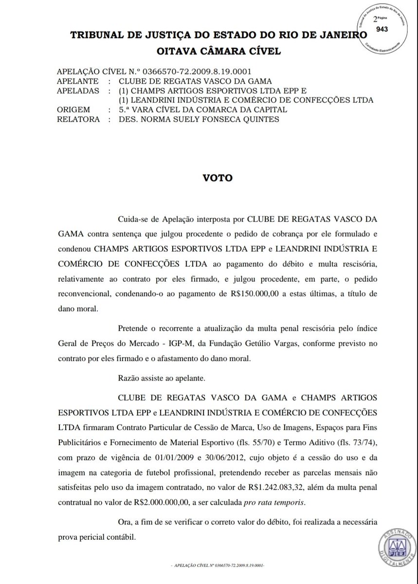 Por unanimidade, a 8a Câmara Cível do Tribunal de Justiça do Rio de Janeiro acatou recurso do Vasco contra a Champs. A relatoria foi da desembargadora Norma Suely Fonseca Quintes. Fornecedora deve pagar mais de R$ 3 milhões ao clube e clube pagará nada a ela. Espia #lanceVAS