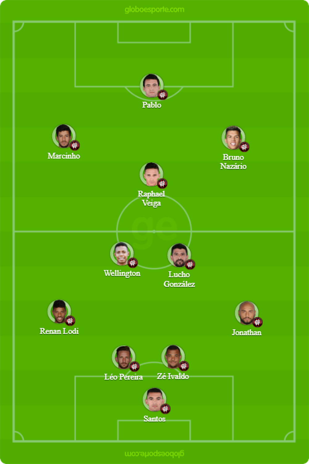 Com isso, o provável time conta com Santos; Jonathan, José Ivaldo, Léo Pereira e Renan Lodi; Wellington e Lucho González; Marcinho, Raphael Veiga e Bruno Nazário; Pablo.