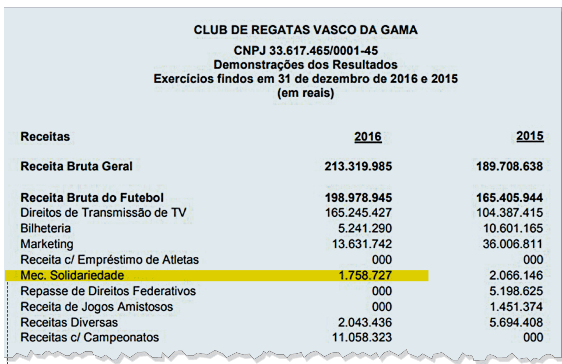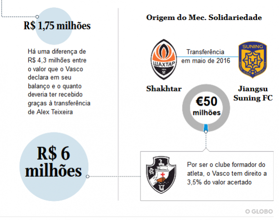 Há uma pergunta sem resposta em São Januário: onde está parte do dinheiro referente ao mecanismo de solidariedade da Fifa de Alex Teixeira? O Vasco diz ter recebido R$ 6 milhões por causa da última transferência do jogador, em fevereiro de 2016, mas apenas R$ 1,7 milhão constam como receita no balanço publicado no ano seguinte. Dessa forma, R$ 4,3 milhões não foram registrados na contabilidade do clube.