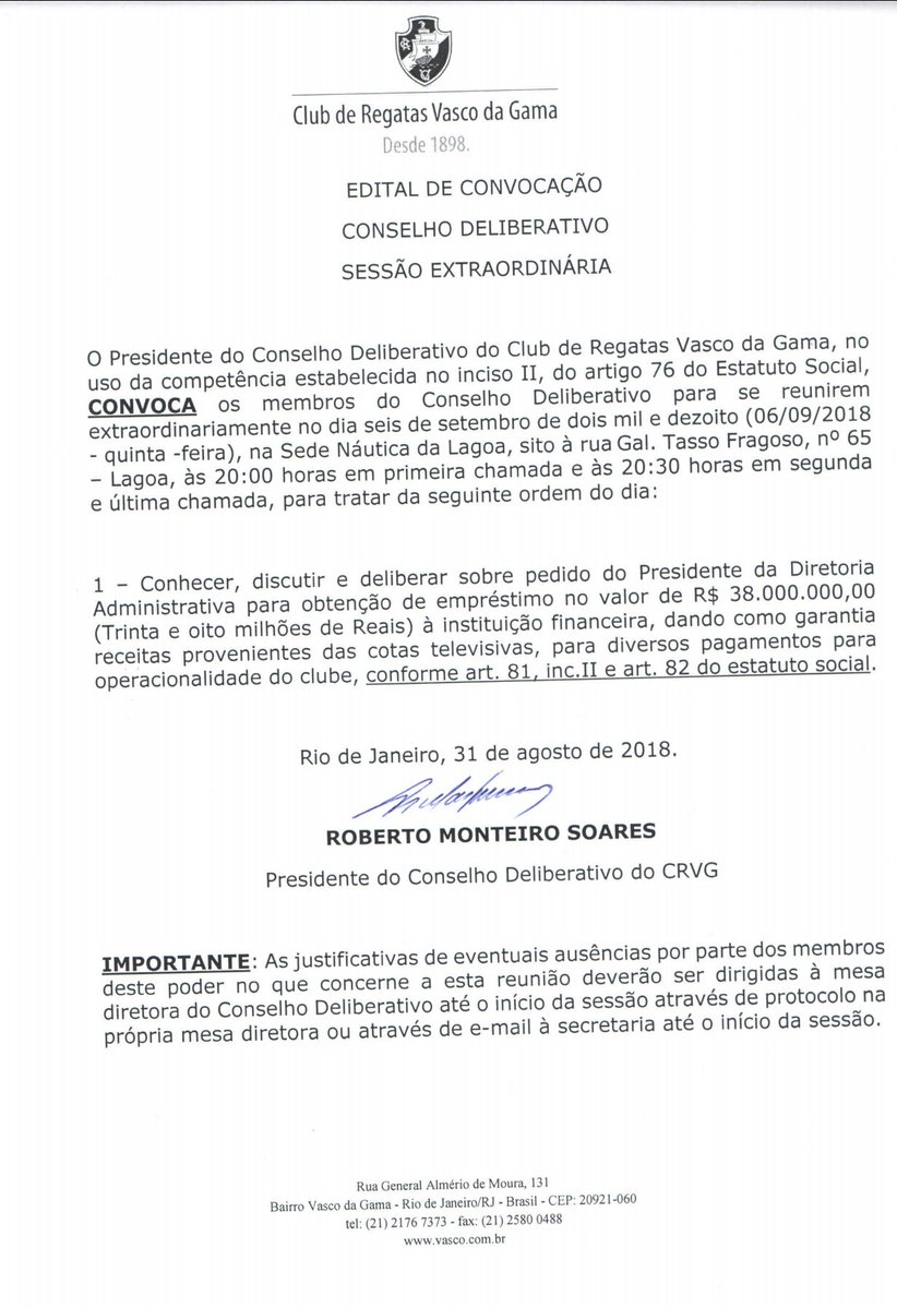 Conselho Deliberativo do Vasco convocado para reunião na próxima quinta-feira, dia 6 de setembro. Em pauta, o pedido de empréstimo da diretoria. #gevas