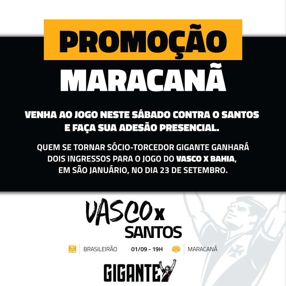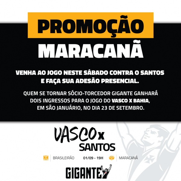 O Club de Regatas Vasco da Gama prepara uma ação promocional neste sábado (01/09), no Maracanã, local do jogo contra o Santos. Quem aderir presencialmente ao Programa Sócio-Torcedor Gigante, irá ganhar um par de ingressos para o confronto contra o Bahia, dia 23/09, às 16h, em São Januário.