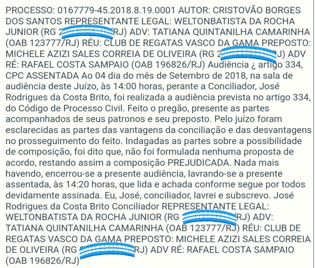 Apenas para completar a informação de mais cedo, espia a ata da audiência de conciliação - a qual terminou sem acordo - que ocorreu nesta terça-feira entre o Vasco e o técnico Cristóvão Borges na 18a Vara Cível do Tribunal de Justiça do Rio de Janeiro #lanceVAS
