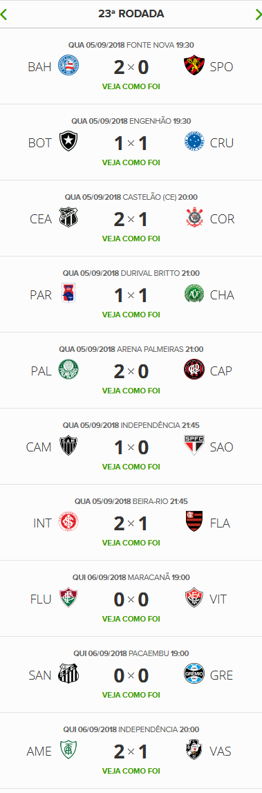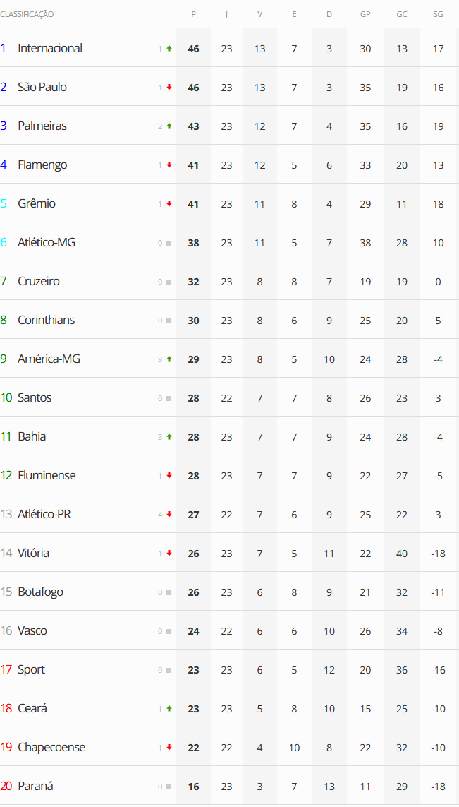 Terminada a 23ª rodada do Campeonato Brasileiro, o Vasco, que perdeu para o América-MG por 2 a 1, segue na 16ª colocação na classificação e agora está a 14 pontos do G6 e continua a 1 ponto do Z4.