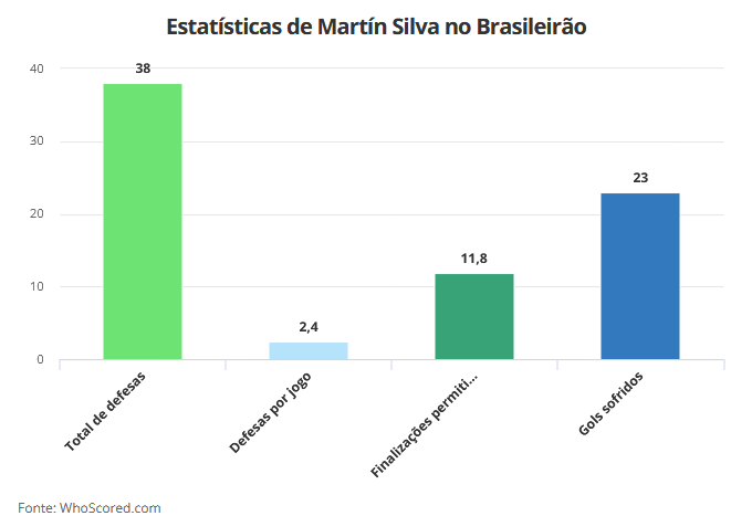 Embora não tenha falhas gritantes nas últimas partidas, Martín chama a atenção por um dado: é apenas o 14º goleiro com mais defesas no Campeonato Brasileiro.