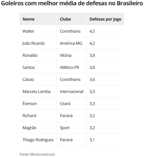 Se for levada em conta a média, e considerando apenas goleiros com pelo menos oito jogos no torneio, ele cai para a 25ª posição, à frente de apenas outros três titulares: Marcelo Grohe (Grêmio), Danilo Fernandes (Internacional) e Anderson (Bahia).