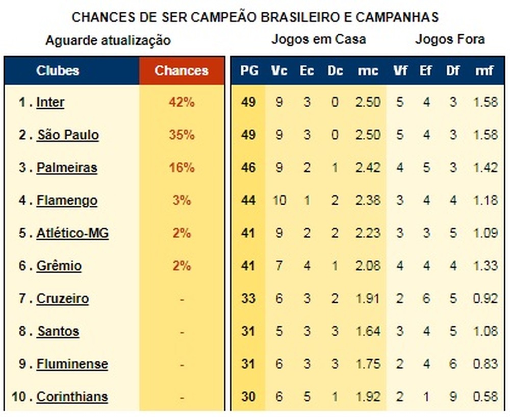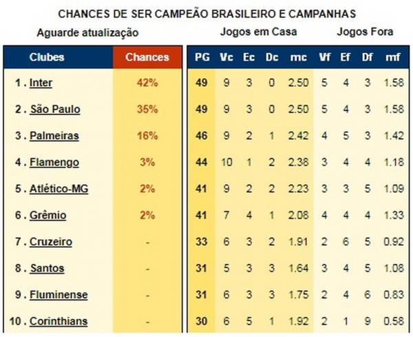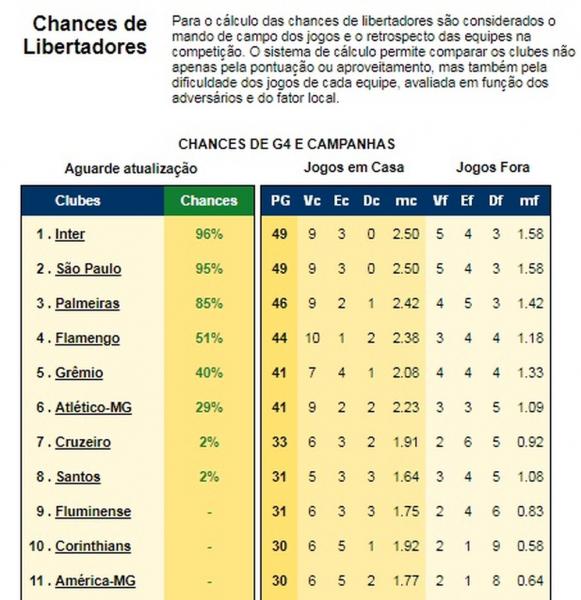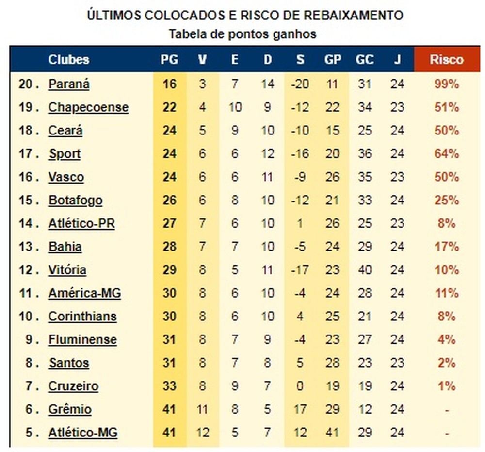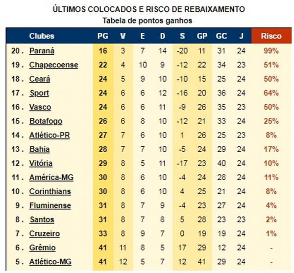 Nesta reta final, dois sites costumam elaborar chances e riscos. O Infobola, de Tristão Garcia, é o mais usado. Tem também o pessoal do departamento de matemática da UFMG.