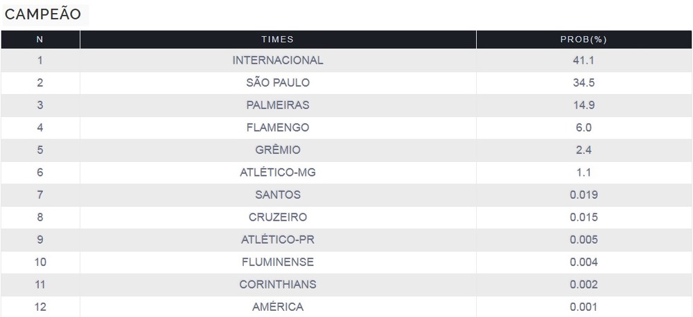 Na probabilidade de título, Inter já alcança 40%, enquanto o Paraná se apresenta muito perto da degola. Confira!
